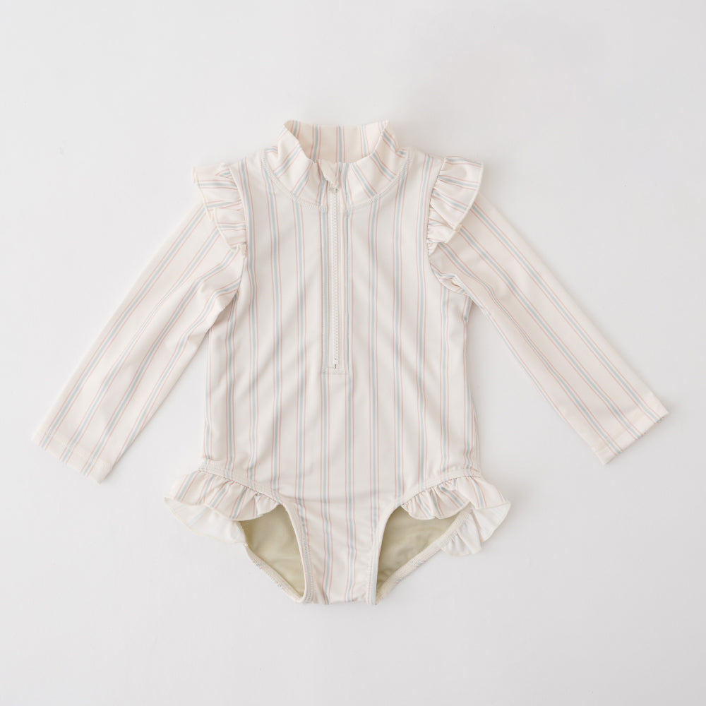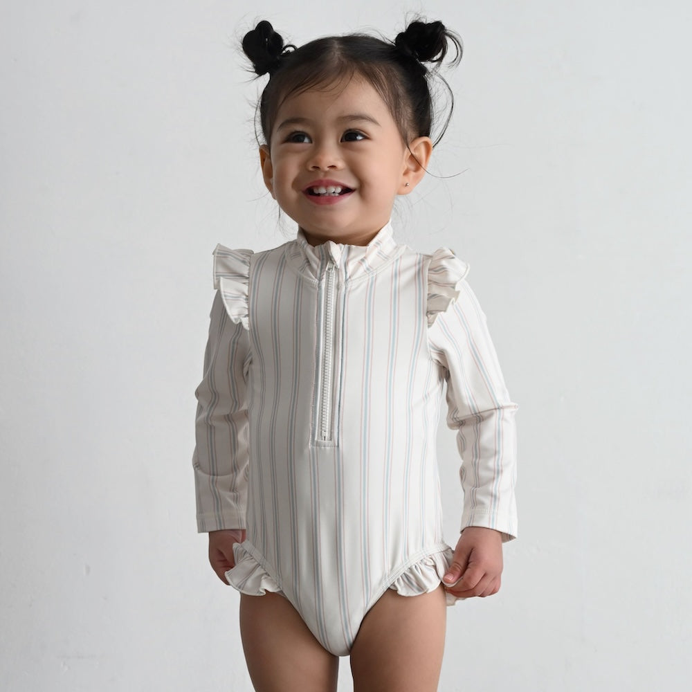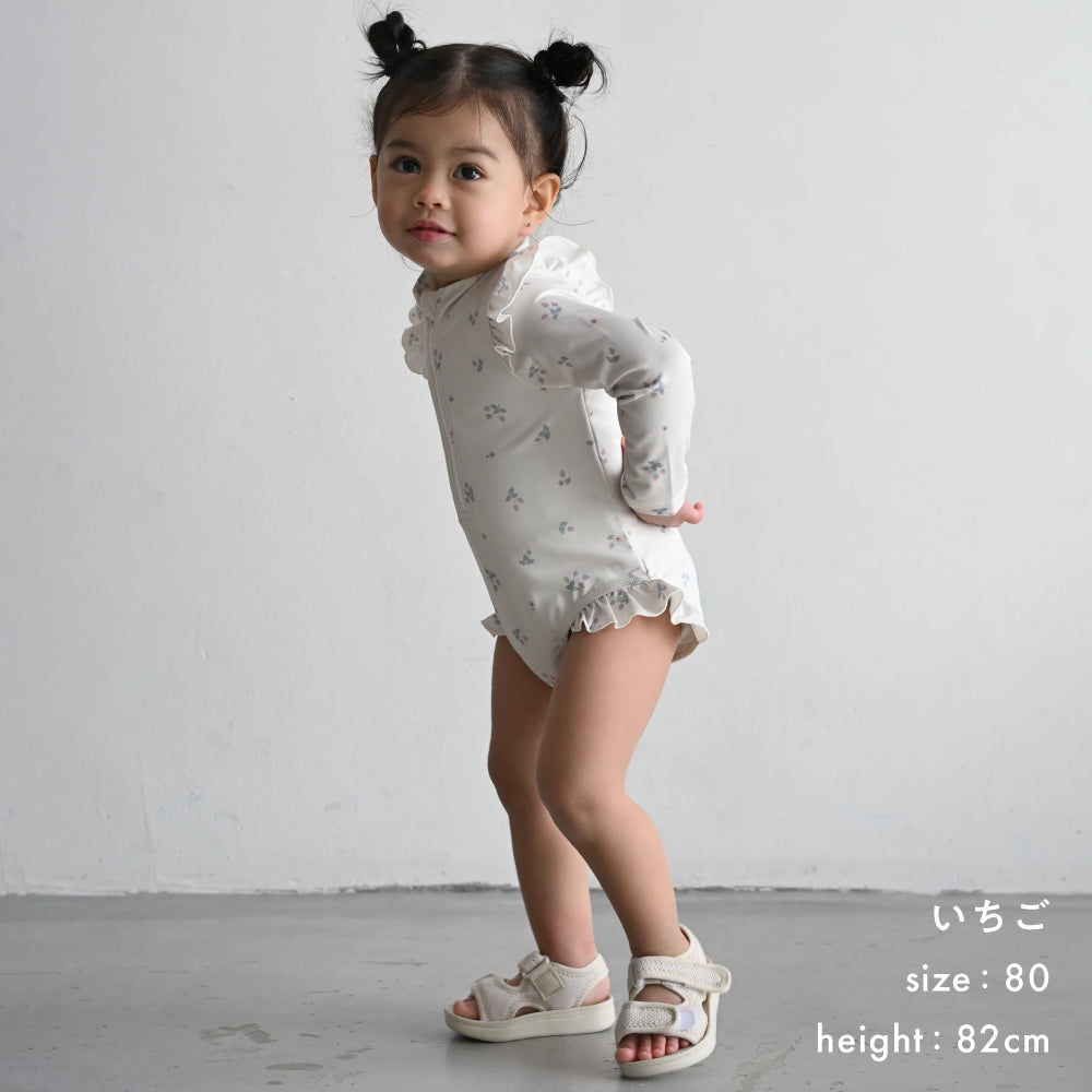 首元モックネックタイプ、深めのフロントファスナーで、着脱簡単。水遊びパンツの上からでもOKなゆったり設計。ファスナーが体にあたりにくい内側ガード付き、首元はファスナーカバー付き。