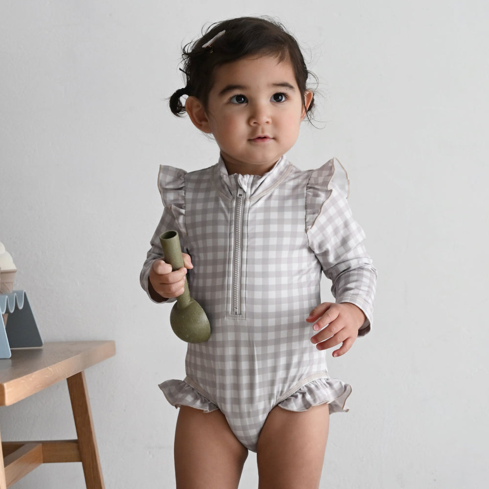もちろんUVカット+長袖タイプなので、日差しを気にせず、思う存分遊ばせてあげられます。(紫外線遮蔽率97%以上※カラーによって多少の誤差があります。)