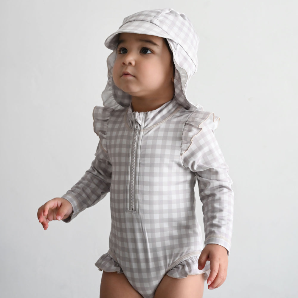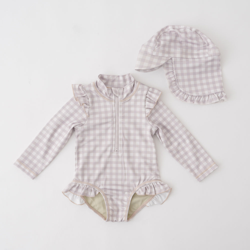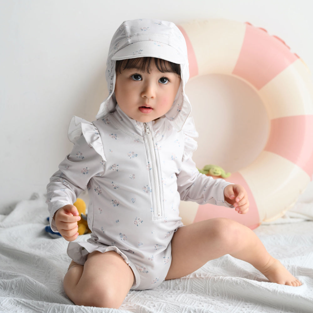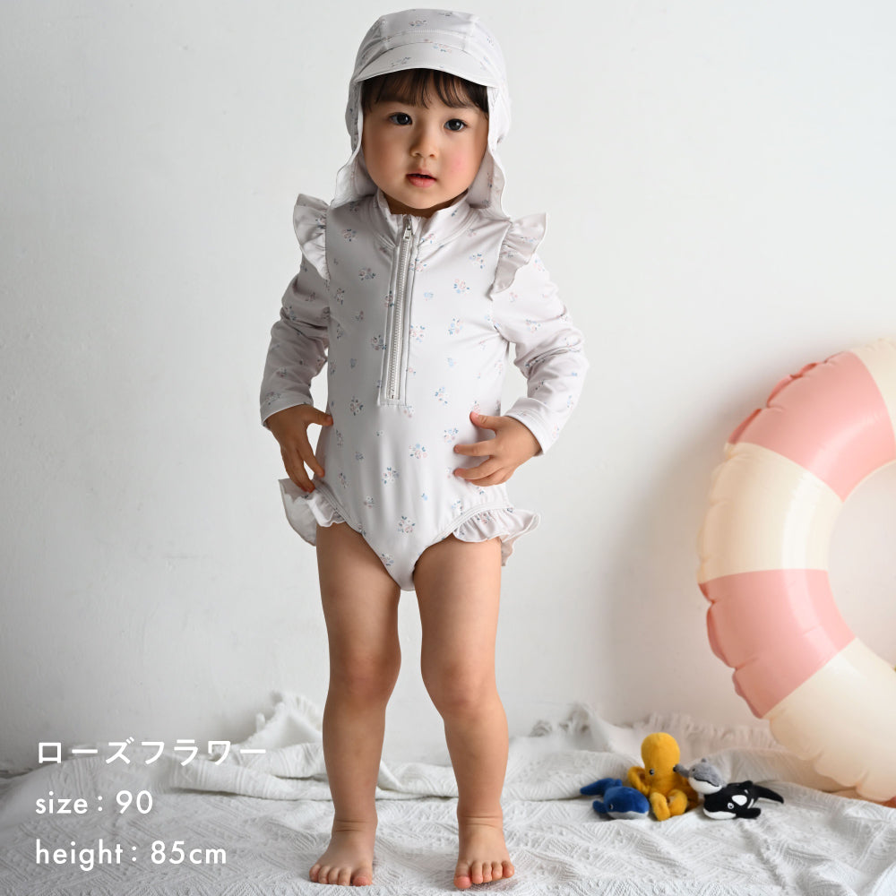 ロンパースタイプのラッシュガードとキャップのセット