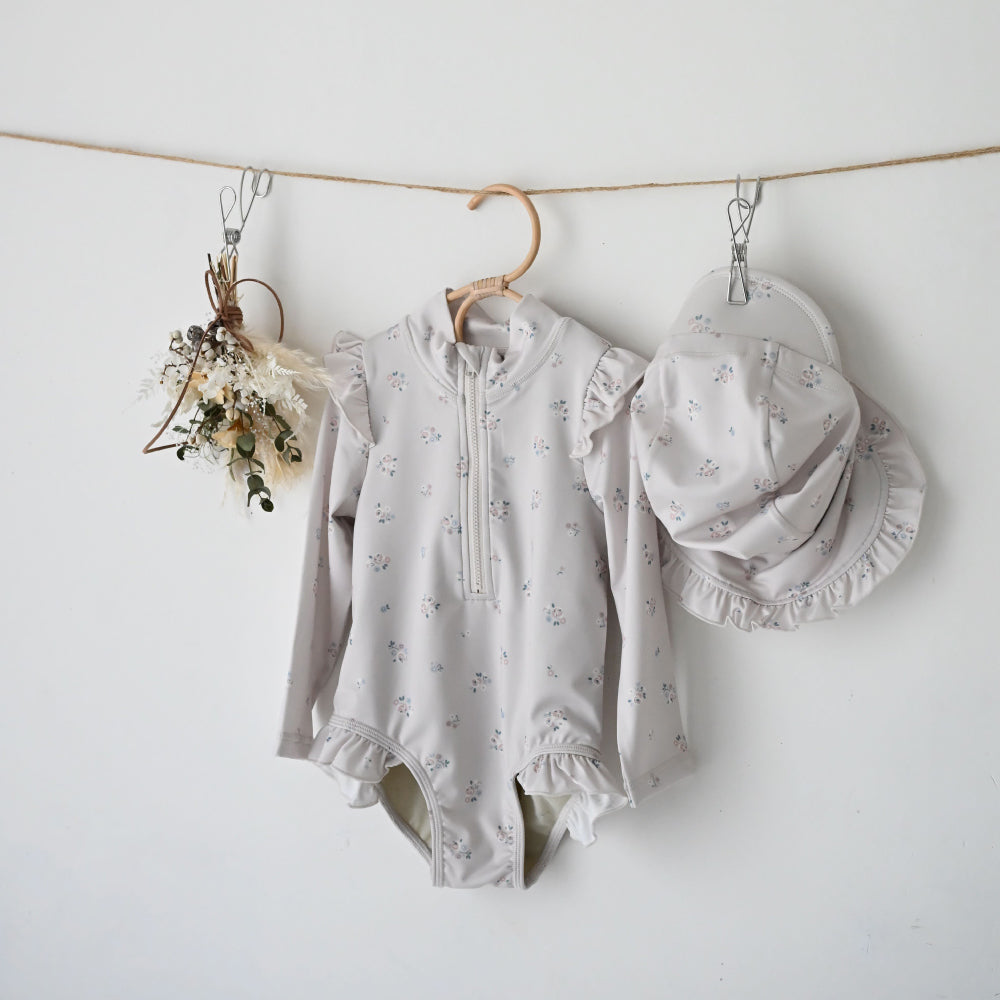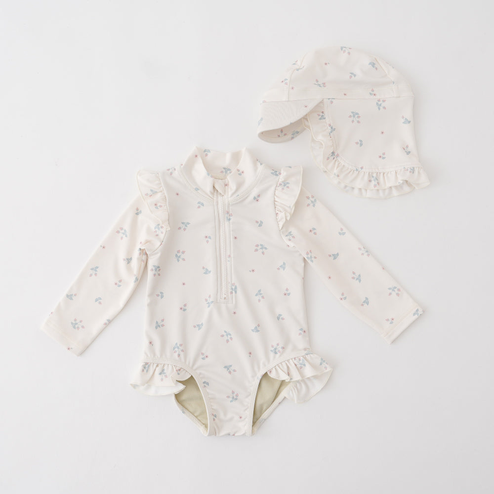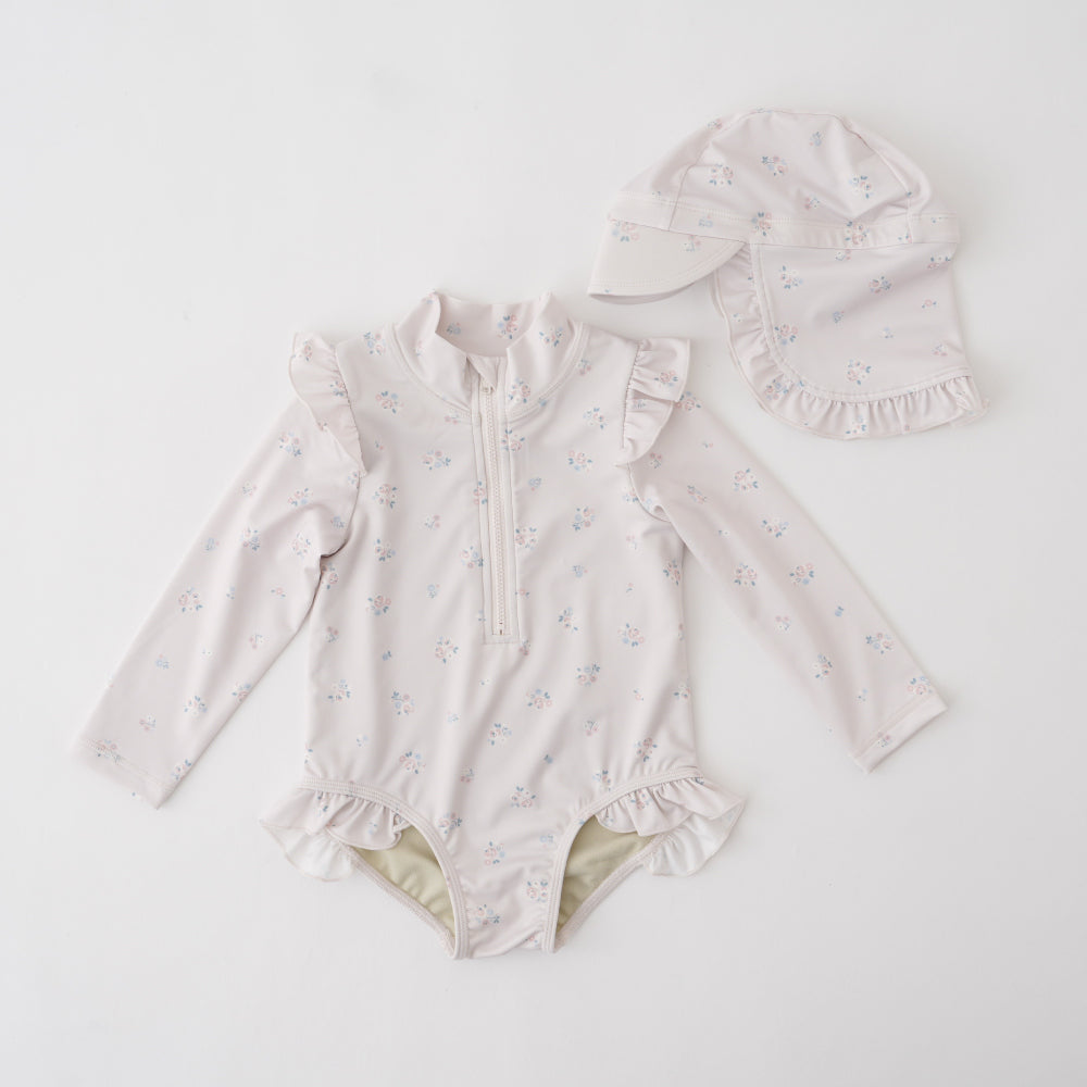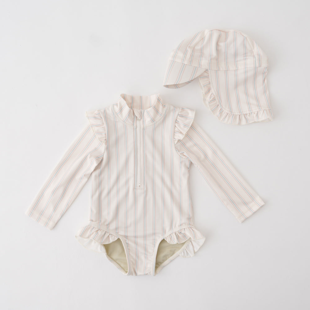 ロンパースタイプのラッシュガードとキャップのセット