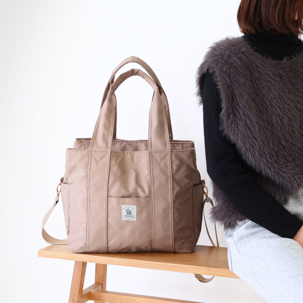 表生地は高級感ある丈夫なポリエステルツイル生地。凹凸感のあるダイヤ型キルトの甘すぎないシックなイメージは高見え&おしゃれ度UP。デイリーユースにかかせない撥水加工なので、小雨や軽い泥はねなども弾いて、お手入れもサッと拭くだけ。※撥水加工は防水ではありません。繰り返しのご使用や効果が薄れた際には市販の撥水スプレー等のご使用をおすすめいたします。