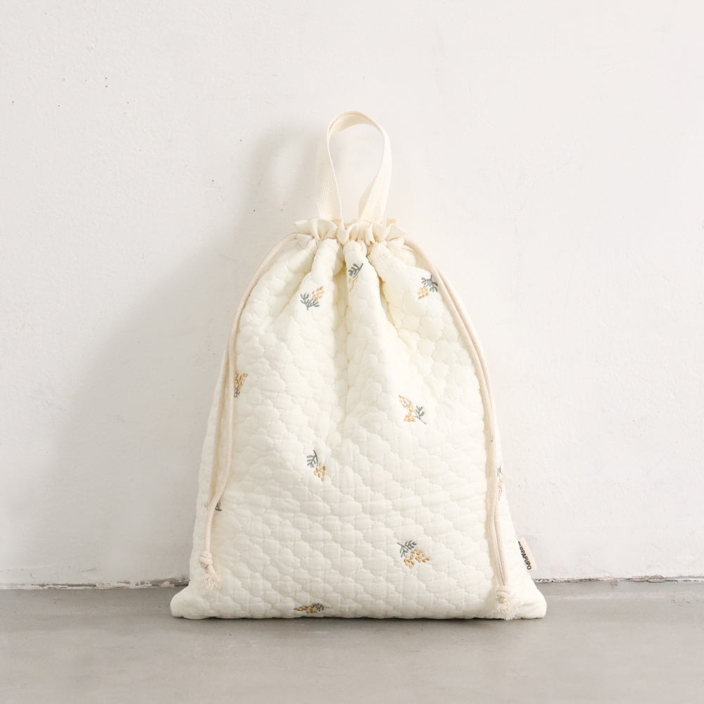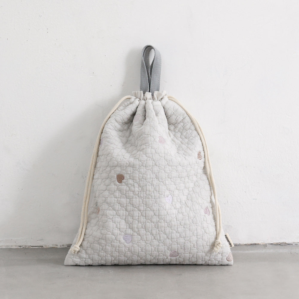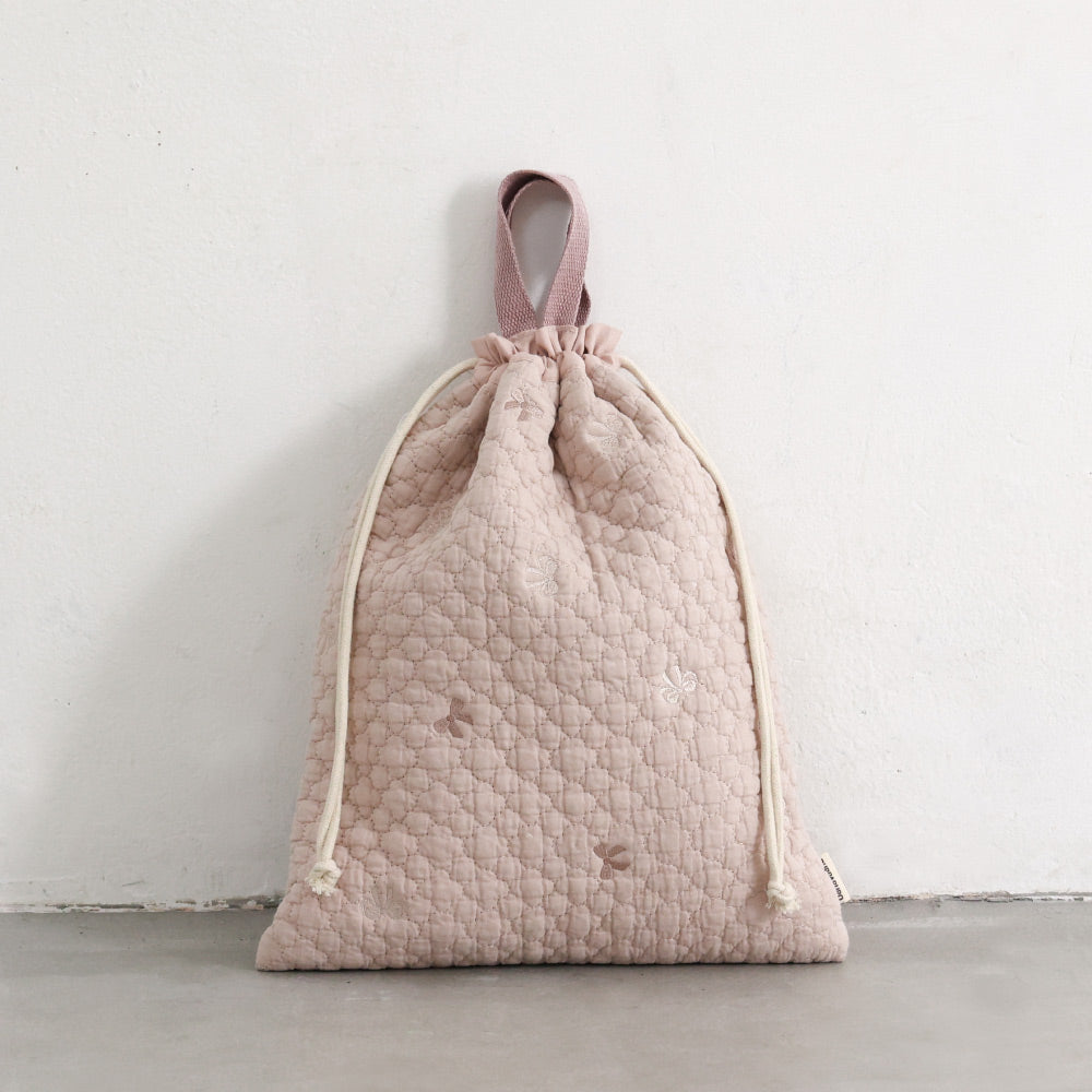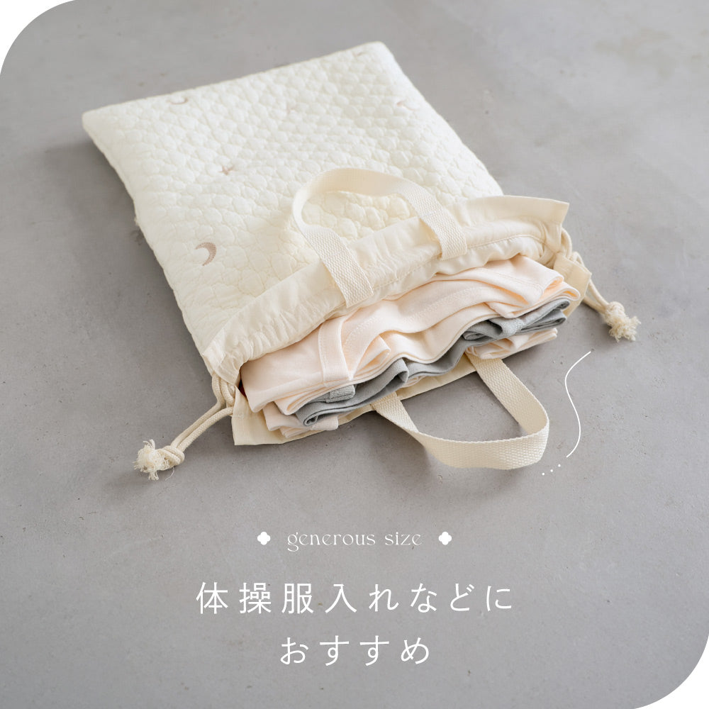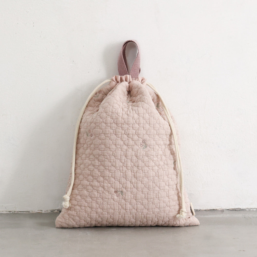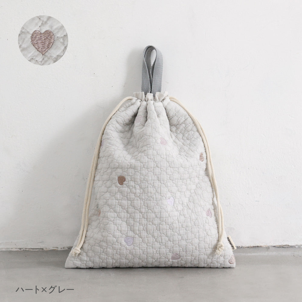 やさしいイブルの風合いにかわいいポコポコキルティングのおしゃれな巾着。小さなお子さま~高学年のキッズが持ってもおしゃれに決まるヌビバッグです。