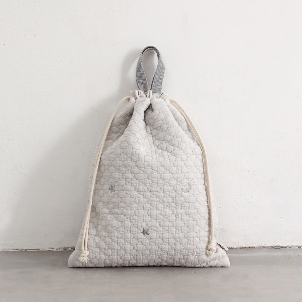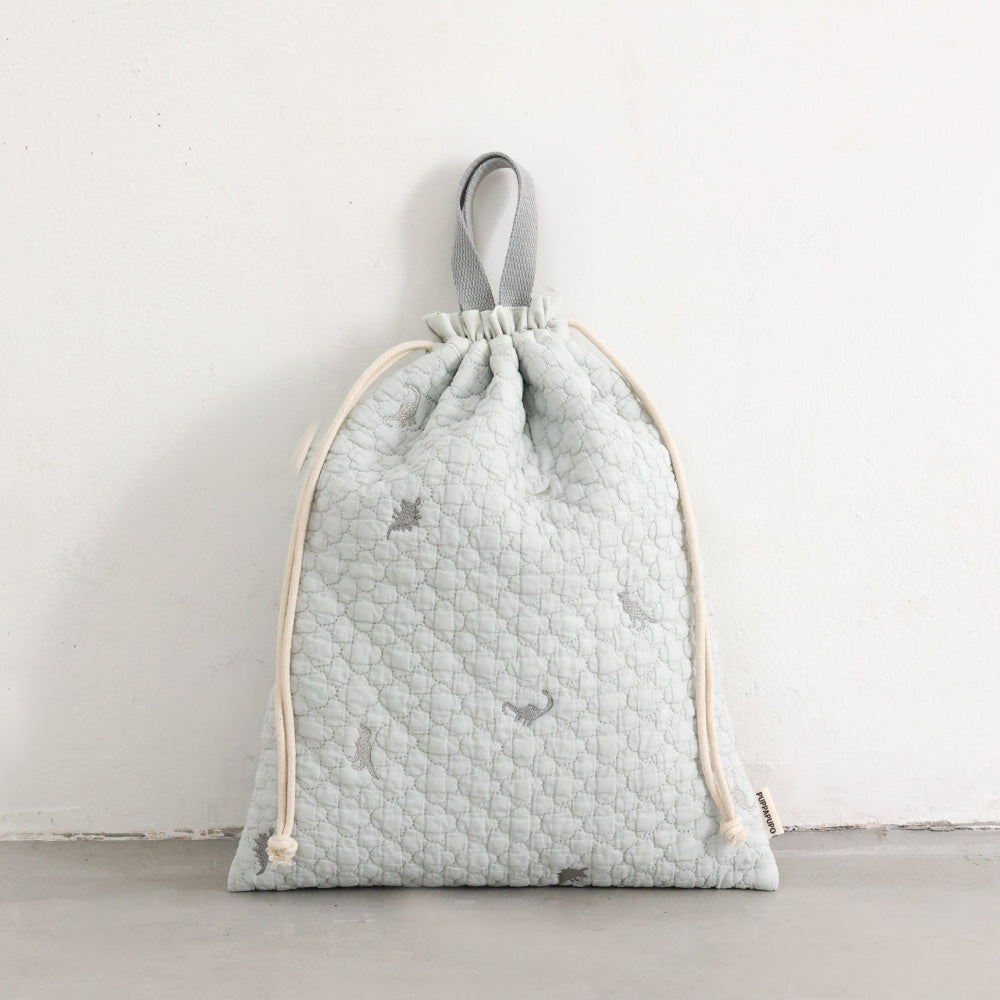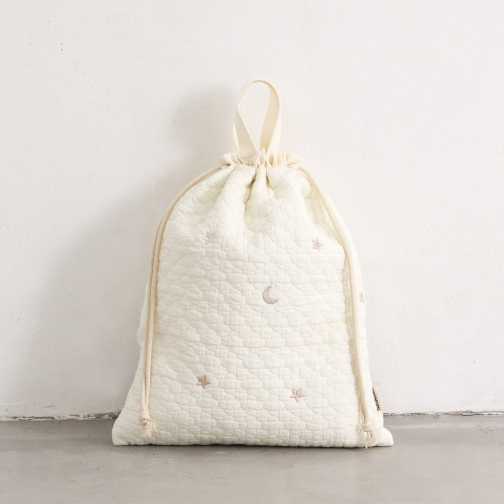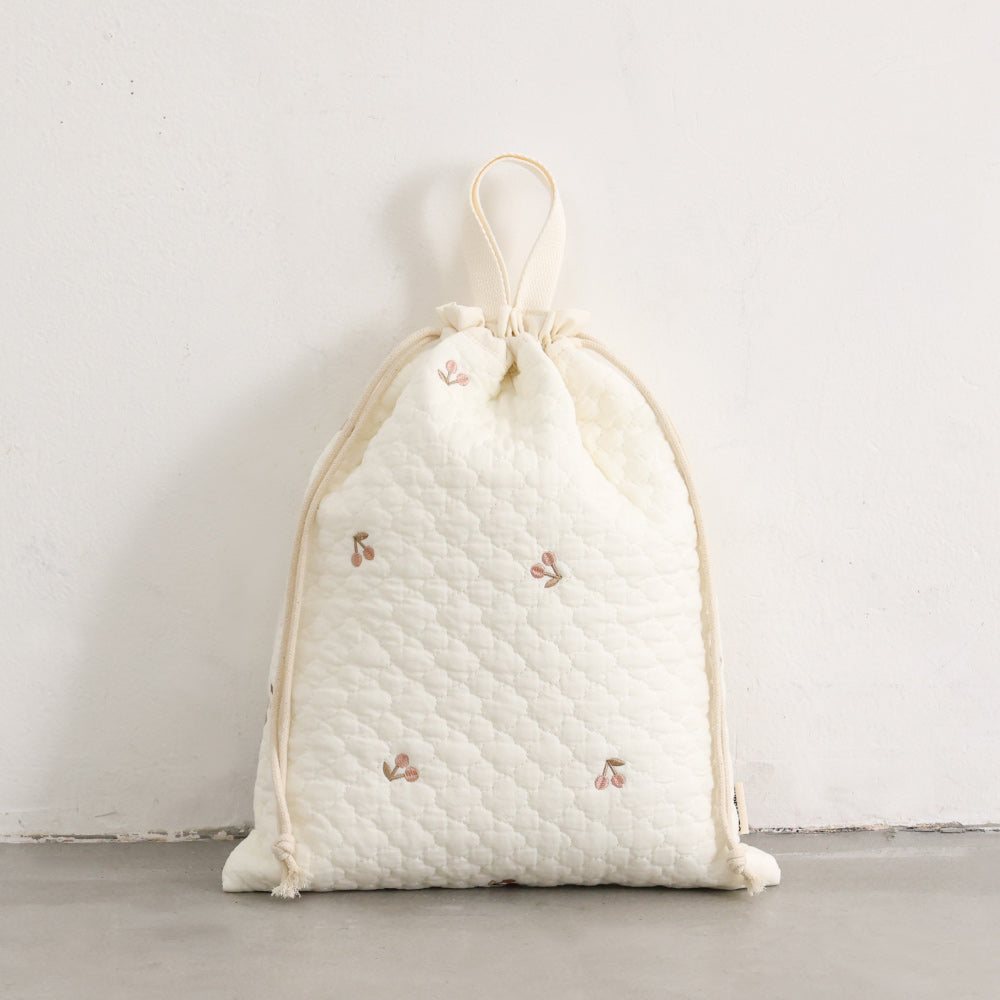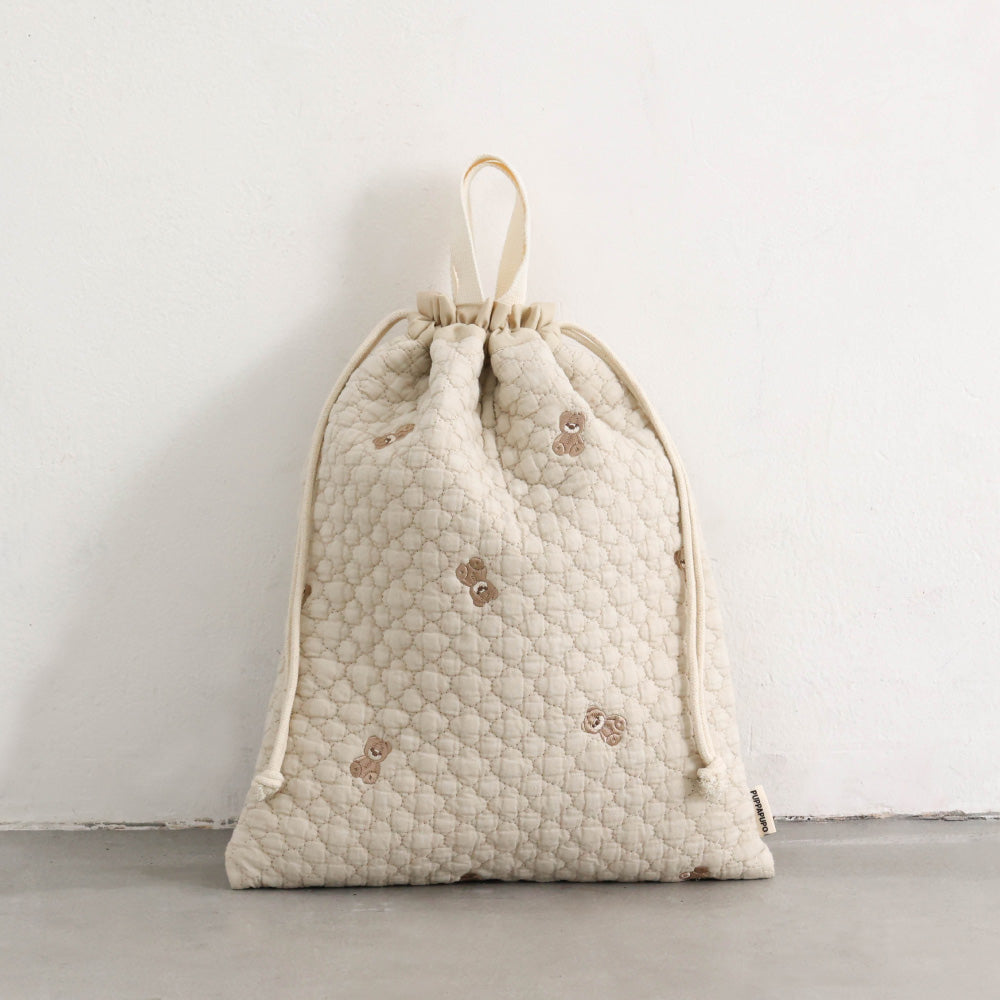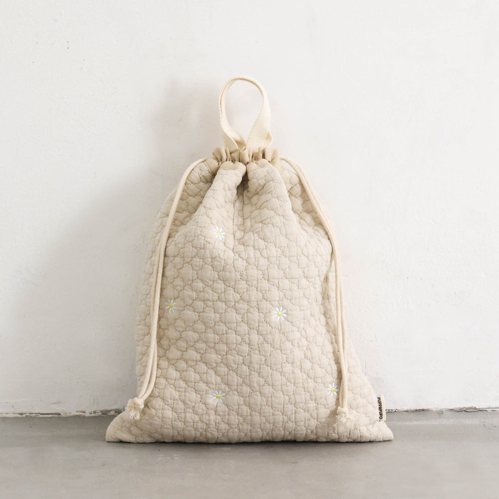 やさしいイブルの風合いにかわいいポコポコキルティングのおしゃれな巾着。小さなお子さま~高学年のキッズが持ってもおしゃれに決まるヌビバッグです。