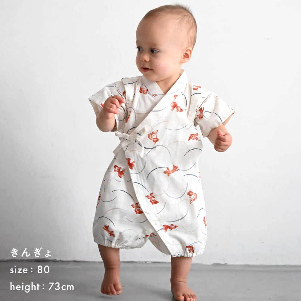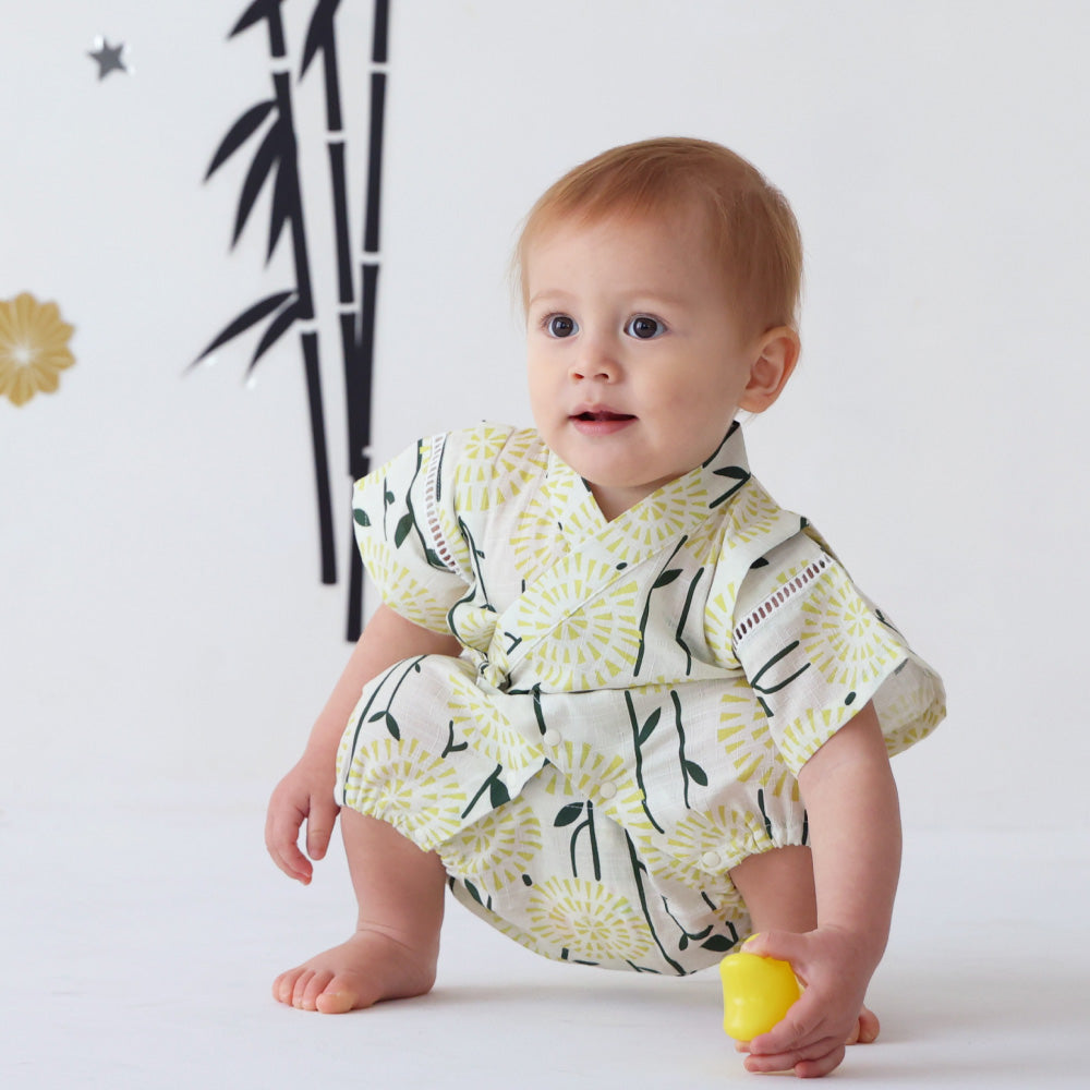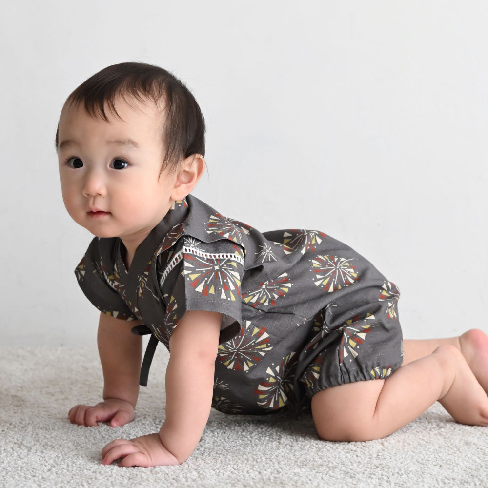 ロンパースタイプの赤ちゃん用甚平。おうちフォトや夏祭り、花火大会、幼稚園や保育園の夕涼み会など、様々な夏のイベントで大活躍する男の子用甚平が登場!ボタンで留めるだけの簡単ロンパースタイプで、軽やかな素材とリラックス感が特長。ルームウェアとしてもおすすめです。派手すぎないお色味で使いやすく、涼しげなデザインが夏らしさを引き立て、夏の思い出に花を添えます。上品で本格的な和柄のベビー甚平で子供たちの夏を華やかに彩ります。