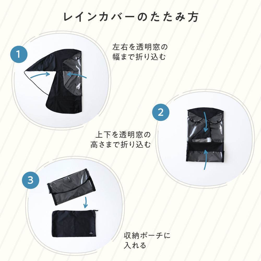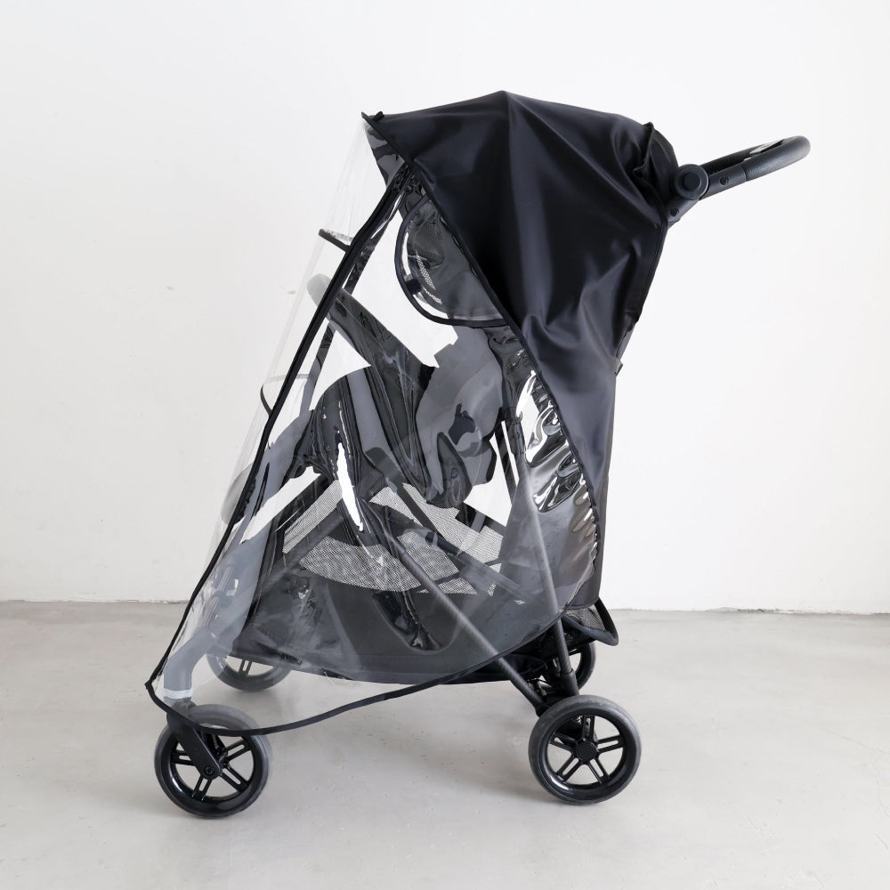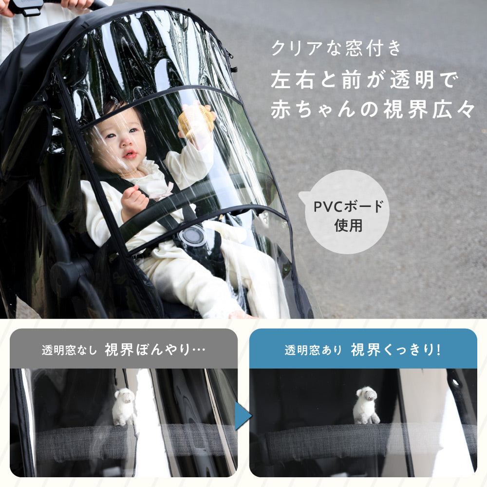 正面は皺にならないPVCボードを使用したクリアな透明窓付き。前方・左右と透明部分が多いので視界も広々で雨の日のお出かけもニッコリ、お互いの顔が見られるのも安心です。