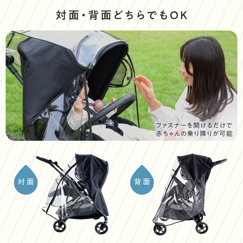 ベビーカーに被せて、ファスナーで開閉、後ろは面テープとバックルを留めるだけなので、急な雨でもサッと設置できるのがうれしいポイント。正面はぺろんとフルオープンできるので、カバー取り付けたままでも乗せ降ろしが楽にできます。