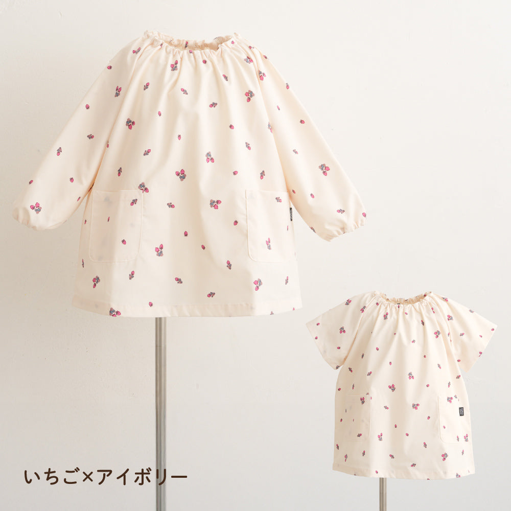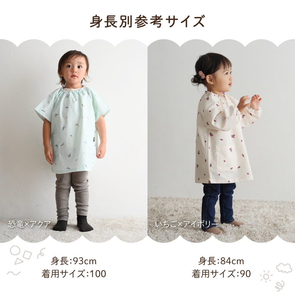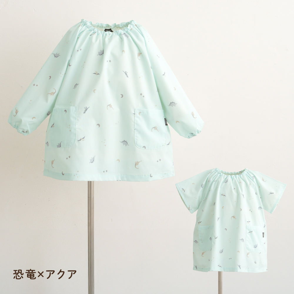 撥水加工生地だからいろいろなシーンで。保育園・幼稚園はもちろん、お絵描きやのりなどを使う工作の時も、お外でのお砂場遊びや水遊びも、お料理やお風呂掃除などママのお手伝いの時も、もちろんご飯の時のエプロンとしても、いろいろなところで大活躍。120サイズまであるので小学生のお習字の墨はね対策や調理実習のエプロンとしてもお使いいただけます。