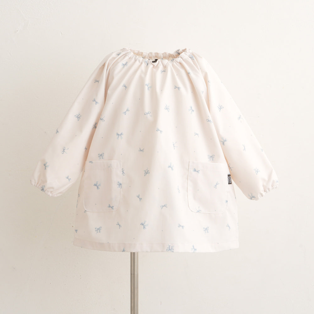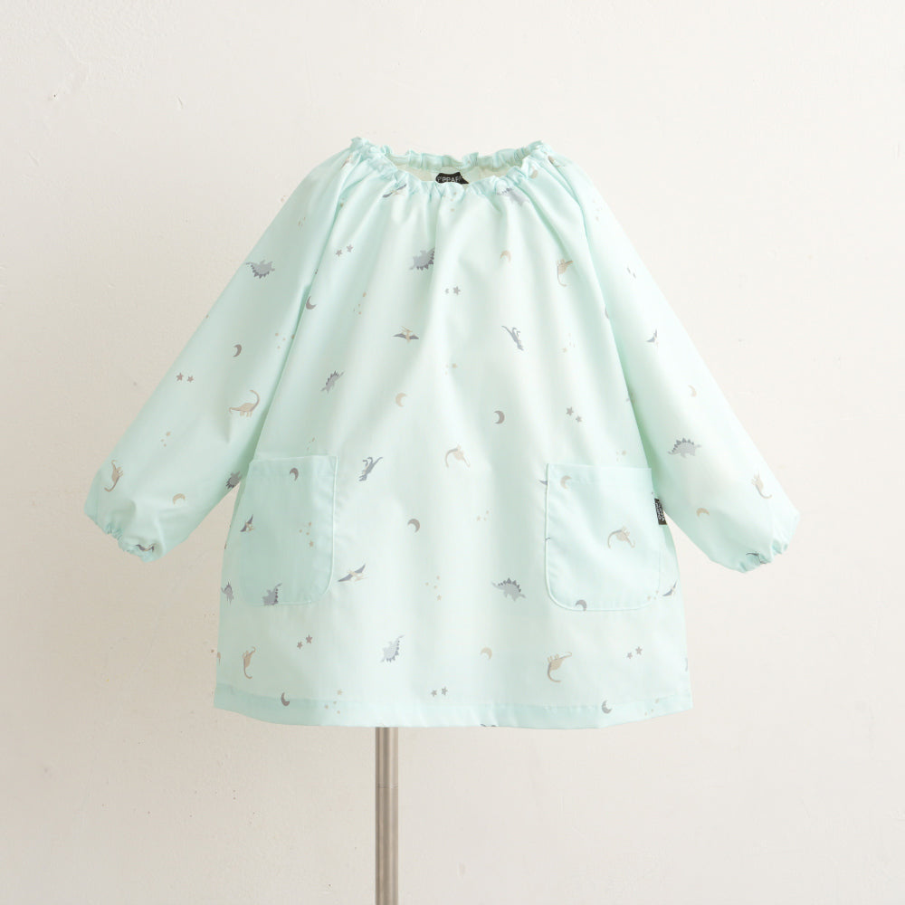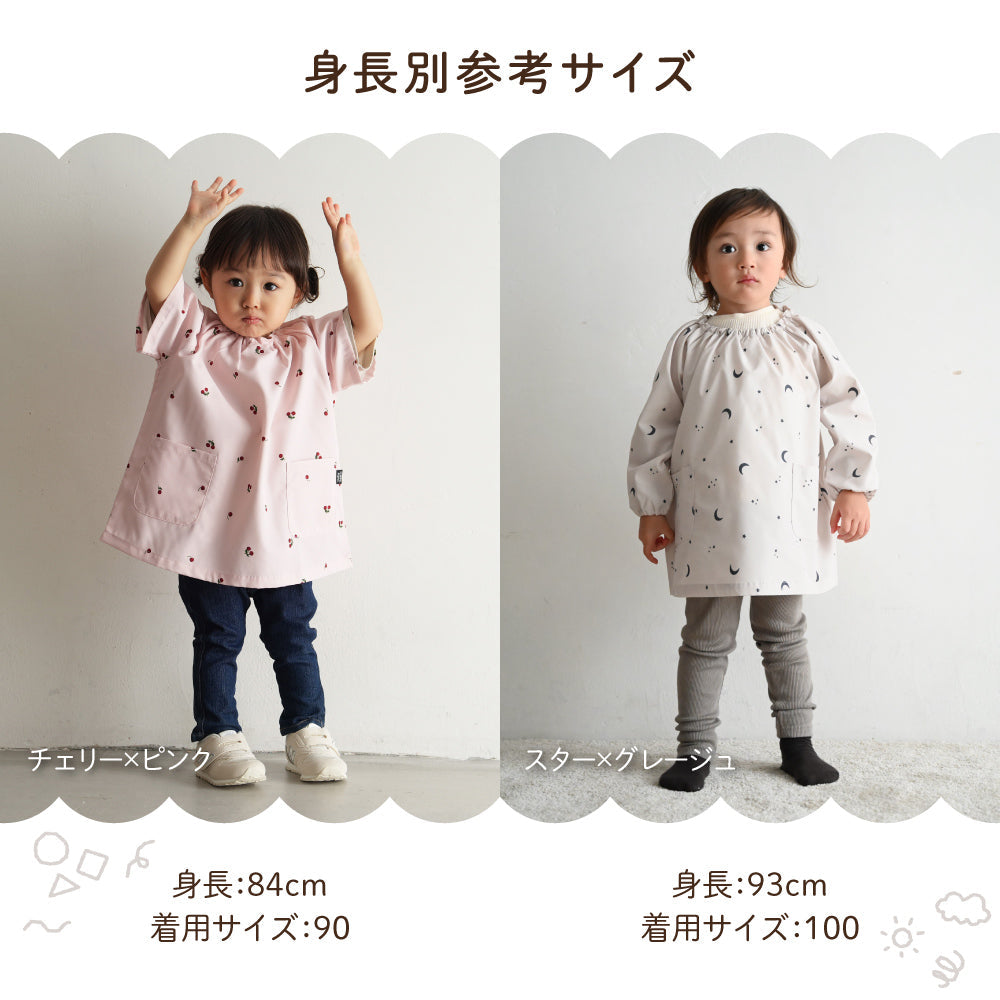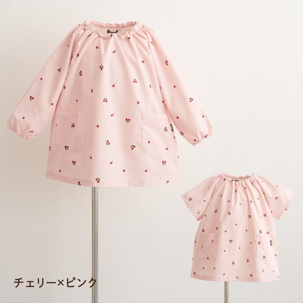 撥水加工生地だからいろいろなシーンで。保育園・幼稚園はもちろん、お絵描きやのりなどを使う工作の時も、お外でのお砂場遊びや水遊びも、お料理やお風呂掃除などママのお手伝いの時も、もちろんご飯の時のエプロンとしても、いろいろなところで大活躍。120サイズまであるので小学生のお習字の墨はね対策や調理実習のエプロンとしてもお使いいただけます。